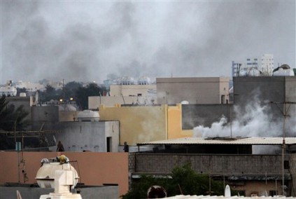 AP Photo – Masked Bahraini anti-government protesters watch from rooftops as tear gas fills the Shiite village of Sanabis, Bahrain, on the edge of the capital of Manama, where protesters engage in daily clashes with violent Security Forces staffed by unqualified foreign nationals.